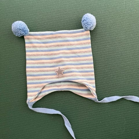 Kivat lue i ull med snøring mørkeblå stripestrikk. 2 dusker. Str 0