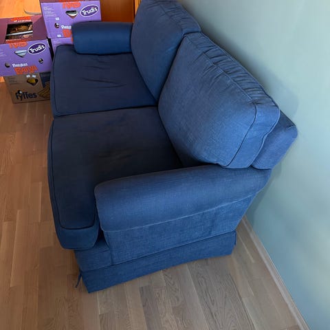 Brukt sofa som har stått i kjellerstue, trenger nok en vask men trekkene kan tas av og vaskes i maskinen. Stor og fin. Veldig mye bruk igjen