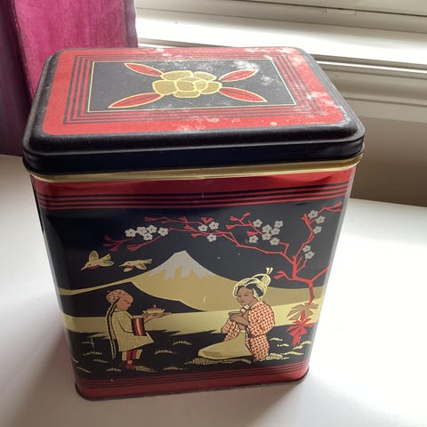 Firkantet blikkboks i metall med hengslet lokk. Boksen er svart med dekorative motiver i lyse farger rundt sidene og på lokket, blant annet skip og landskapsscener. Innsiden er i ubehandlet metall. Egner seg til oppbevaring av for eksempel kjeks, te, småting eller som dekorasjon i kjøkken eller stue.