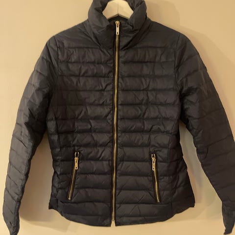 Marie Philippe lang dunjakke størrelse M. Jakken er grå med et mønster og har hette med pelskant. Den har elastisk midje med belte for justering. Myk og varm