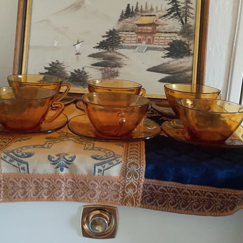 To gule/ravfarget tekopper med skåler fra franske Vereco selges for kr 100,- per stykk. Veldig fine, som nye.
