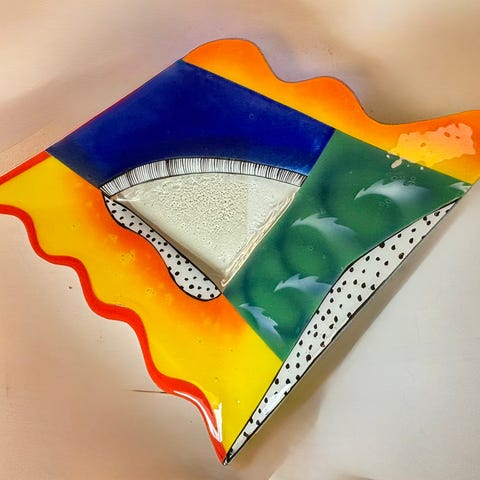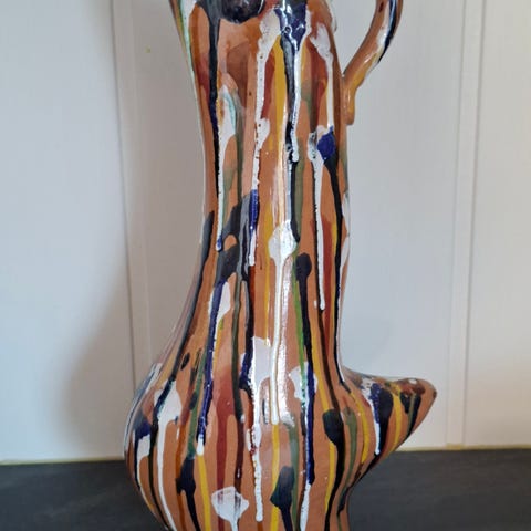 Håndlaget veggspeil i keramikk med malt dekorativ ramme i nydelige farger kjøpt på Risør kunsthåndmarked (Villvin-festivalen). Laget av Nina Gresvig; kunstner som har holdt til i Risør i svært mange år.