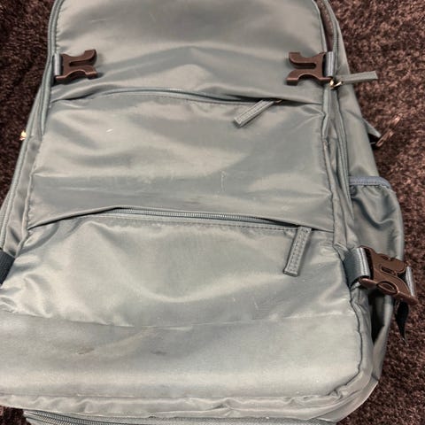 Kul ryggsekk i stoff selgen. Den har noen synlige bruksmerker som det er tatt bilder av. Sekken har en liten lomme og et hovedrom. Selges pga. lite brukt de siste årene.