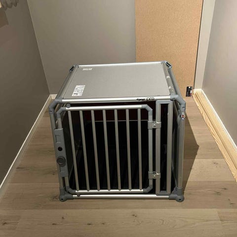 Buret er i god stand, uten nøkler til låsen, beregnet for en stor hund.