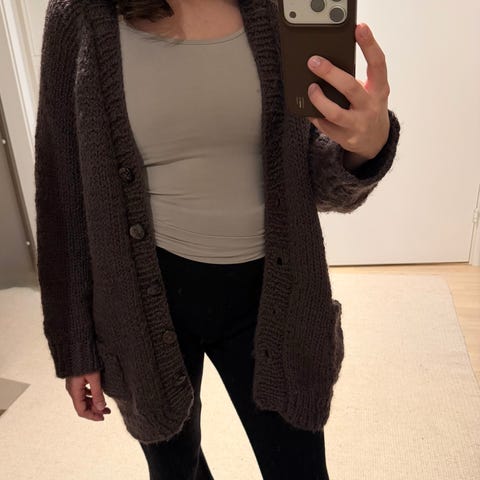Nydelig syrinfarget cardigan strikket av meg selges kr 700. Ta kontakt ved interesse for mål osv.