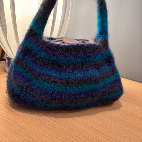 Nydelige små håndvesker som passer til både hverdag og fest. Egendesignede tovede vesker. Ca 10 høye og 20 cm brede. Finnes i mange farger og kan bestilles i ønsket farge.