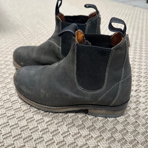 Ukjent merke ridehest støvler i svart lær, designet for dame/jente. Støvlene har en glatt overflate. Størrelse 36, med gummisåle for bedre grep. Passer til ridning og annet utendørs bruk.