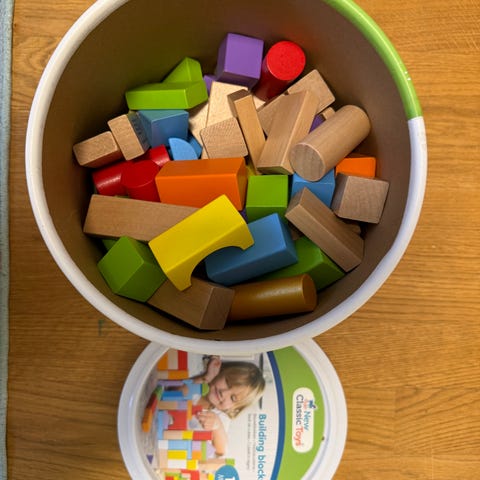 Byggeklosser i tre - diverse selges med oppebvaringsboks