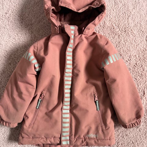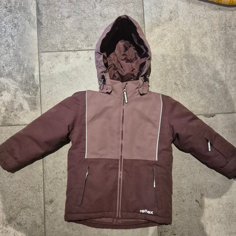 Pent brukt vinterjakke med snøstopp og mange reflekser.