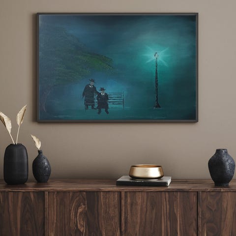Søkeord: Noir, bilde, maleri, gothic, bylandskap, stemning, mystikk, mystisk, gotisk, dekor, veggkunst, kunst, abstrakt, figur, figurer, historie, mørkt, fortelling, tåke, gatelys