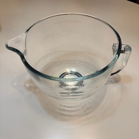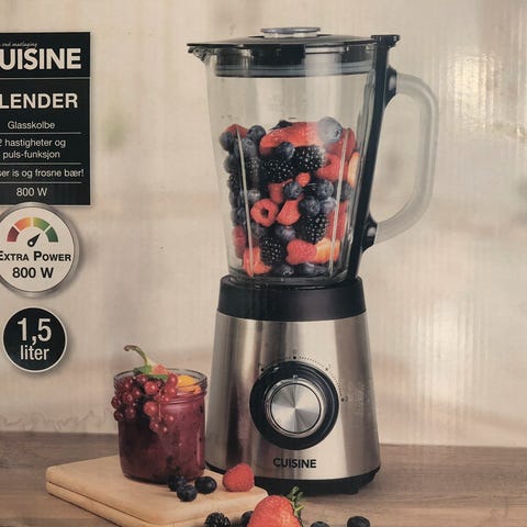 KitchenAid blender med hvit base og glasskanne. Blenderen har flere hastighetsinnstillinger inkludert pulsfunksjon, og er utstyrt med rustfrie stålblader. Passer til miksing av ulike ingredienser til matlaging og drikke.