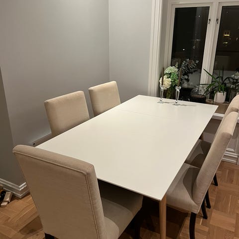 Praktisk og flott spisebord fra Bolia. Kan stå som det er eller «brettes ut» fra 96 cm til 192 cm slik at det blir langbord. Må hentes på Sandsli, Bergen. Bordet er ikke oljet.