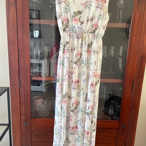 Zara sommerkjole i flerfarget mønster, størrelse 36 for kvinner. Kjolen har korte ermer, dyp V-utringning og et knyttet midjebånd. Materialet er lett og egnet for varme værforhold. Silke