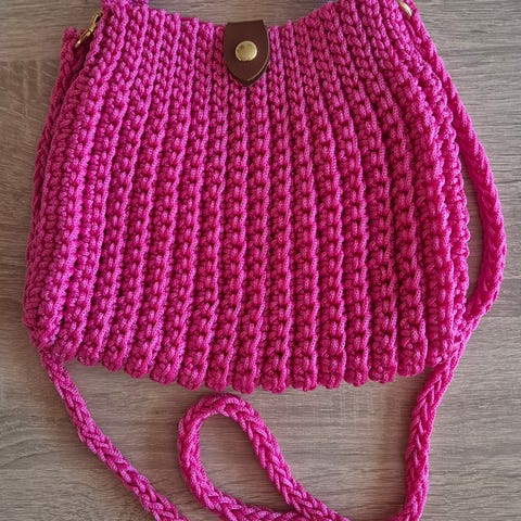 Heklet clutch i fargen burgunder med dobbelt Ribbongarn fra Hobbii. Ramme/veskelås er 23 cm, og høyden på vesken er 22 cm med rammen.