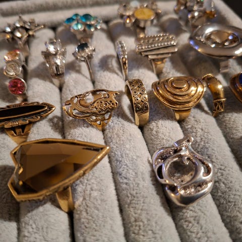 To fine ringer. To stener er borte på gullringen, DK. Ikke noe å si. Str lll.