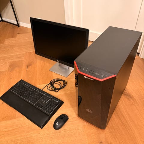 Gaming PC med hvitt kabinett og sidepanel i glass. PC-en har moderne design med synlig intern maskinvare gjennom glasspanelet. Lite brukt.