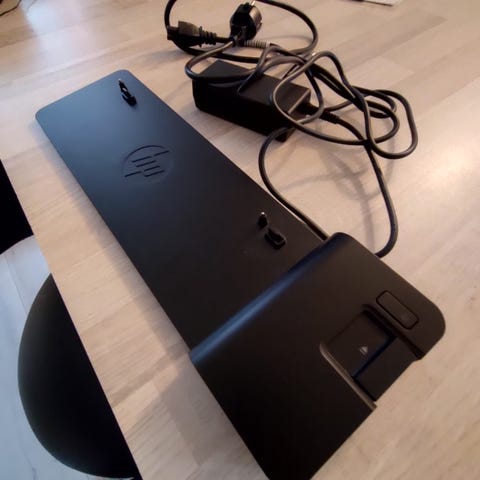Selger dokkingstasjon HP HSTNN-I09X med HSTNN-LA09 strømadapter/AC-adapter (output 19V - 7.89 Amper) og strømkabel (C5). Det følger med også nettverk og tele -kabel.