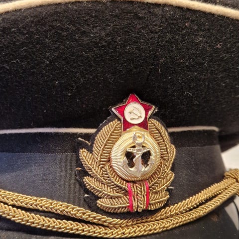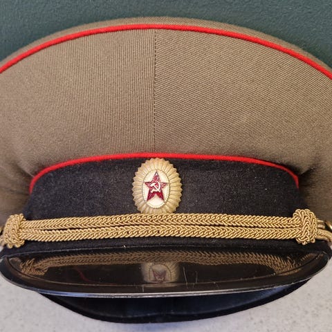Sovjetisk/russisk militær uniformslue/pilotka med diverse påsydde og løse merker og emblemer. Passer som samlerobjekt eller for historisk gjenbruk. Størrelse 56.