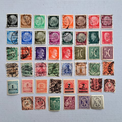 100 forskjellige frimerker fra Det Tyske Rike (Deutsches Reich) mellom AFA 18 og 521 (1872-1934). Verdi etter AFA-katalogen for 2014 regnet til ca kr 1 450.