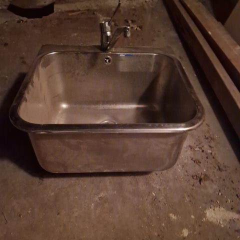 Emaljert vegghengt vaskekum laget av metall. Produktet har en avrundet form med hull for avløp og festepunkter for montering på vegg. Vaskekummen er hvit med enkelte bruksmerker og rustflekker, noe som indikerer tidligere bruk. Egnet for bruk i vaskerom eller lignende miljøer.
