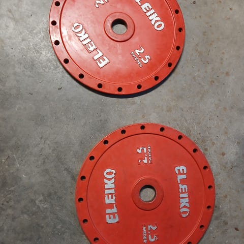 Selger et sett med Eleiko teknikkvektskiver. 2x2,5kg og 2x5kg.