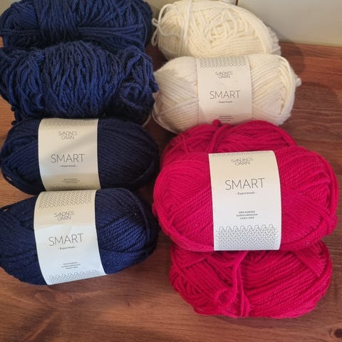 Sandnes Garn Iglo garnpakke med flere farger inkludert blå, hvit, rød, gul og grønn. Garnet er laget av ull og egnet for strikking.