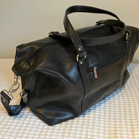 Mørk brun lærbag med fine messingdetaljer. Tykt og slitesterkt lær. Innvendig foret.