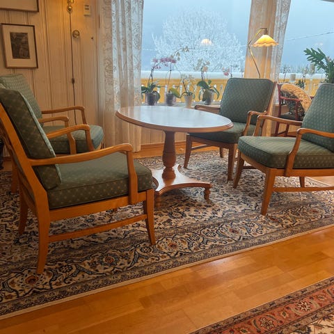 Sitteputen trukket i fløyel er hel og fin, men med litt fargeforandringer i stoffet
