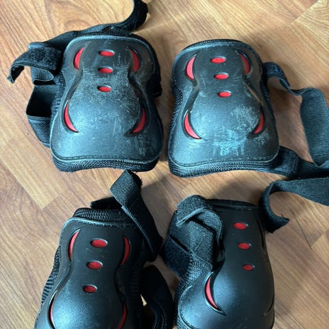 Pent bruke kne, albue og håndbeskyttelse i svart, str xxs. Passer til barn opp til 6-7 års alder, kommer litt an på høyde/vekt. Knebeskytterne er litt oppskrapet. Passer fint til skating, scoot, rulleskøyter og bmx.
