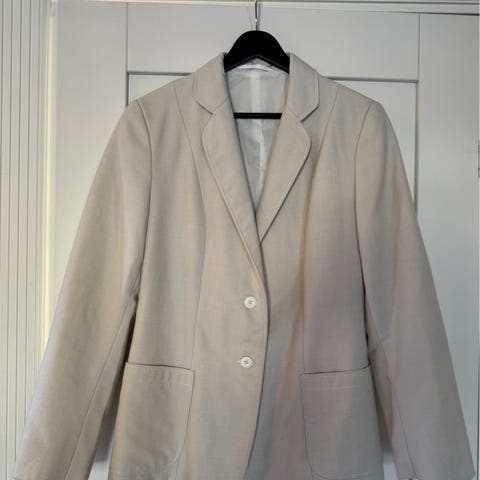 Beige blazer jakke i størrelse M for kvinner. Jakken har dobbelspent knappelukking og er laget i et materiale med glatt overflate. Passer til formelle og uformelle anledninger.