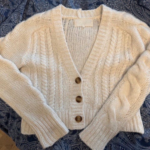 Pia Tjelta Carla cardigan i alpakkamiks. Farge: naturhvit. Nydelig cardigan i flettet mønster. God og varm. Oppleves som normal i størrelsen. Kort modell. Cardiganen er ikke brukt, og merkelappen sitter fortsatt på. De fire første bildene er lånt.