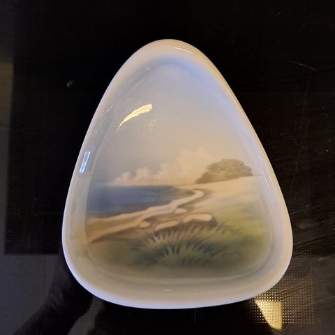 Royal Copenhagen Lyngby-fat med maleri av et kystlandskap