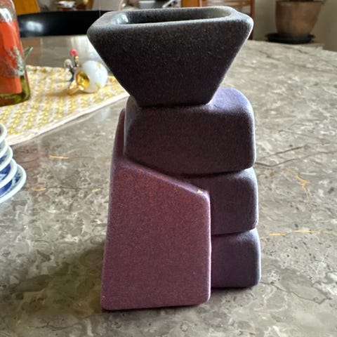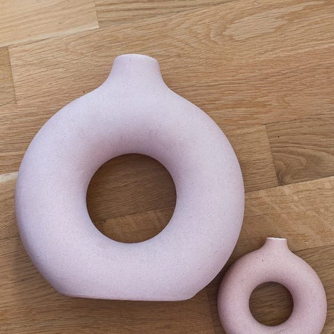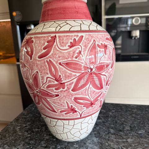 En flott keramikk vase i flott rosa/lilla glasur. I pen stand.