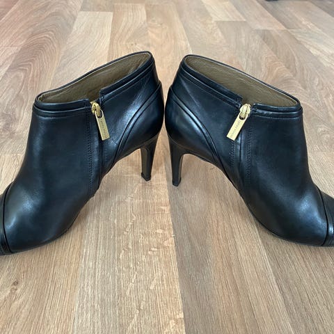 Gino Rossi. Mørk brun. Høyde på hæl ca. 10 cm. Oppbygd såle foran er ca 2 cm. Tror ikke det er ekte skinn, men er usikker.