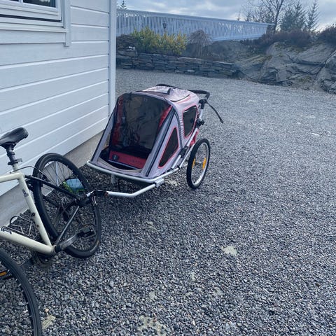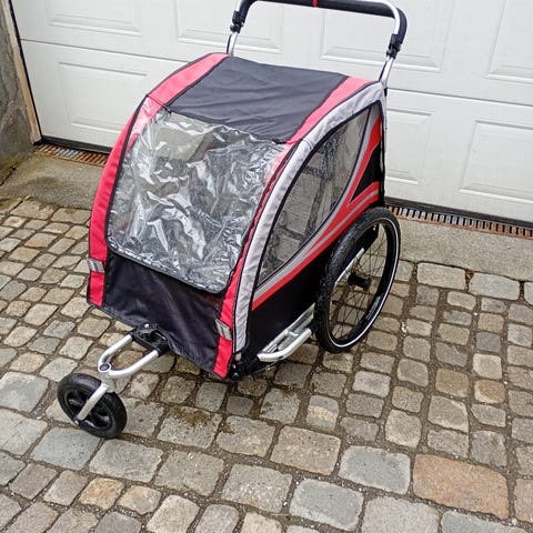 Brukt sykkelvogn for to barn. Vognen har bredt sete som gir god komfort samtidig som vognen har god ventilasjon og fritt utsyn for barna.