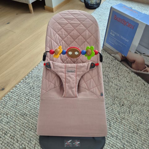 Vippestol med leker, ingen hull, litt falmet men fortsatt i god stand.