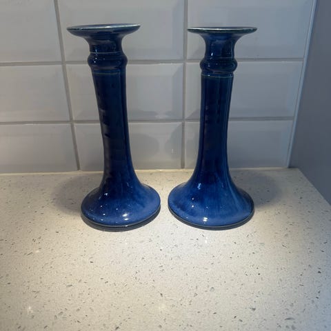 Disse to flotte lysestakene er formgitt av keramiker Terje Sørli, Årvoll keramikk. Stakene er i nydelige farger: blå sjatteringer med islett av grønt. Stakene er i to høyder, og passer godt ved siden av hverandre eller sammen med andre blå staker. Blank og pen glasur uten skader eller nagg. Det finnes noen bruksspor, men ikke noe skjemmende. Se bilder! Begge stakene er signert under. Stor stake: Høyde 20,5 cm. Diameter oppe 7 cm. Diameter nede 10 cm. Lavere stake: Høyde 14,5 cm. Diameter oppe 6,5 cm. Diameter under 9,2 cm. Samlet vekt: 953 g