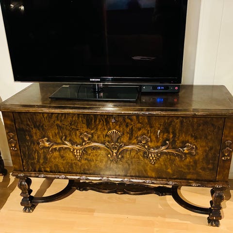 Kommode/sjenk selges grunnet flytting. Vakker og romslig antikvarisk inspirert kommode i flott espresso brunfarge med dekorative detaljer. Møbelet har to skaphyller, og tre skuffer, samt tre uttagbare brett øverst på kommoden, se vedlagt bilde. Gir godt med oppbevaringsplass og passer fint til både stue, gang eller spisestue. Bemerk at nøkkel 🔑 medfølger ikke.