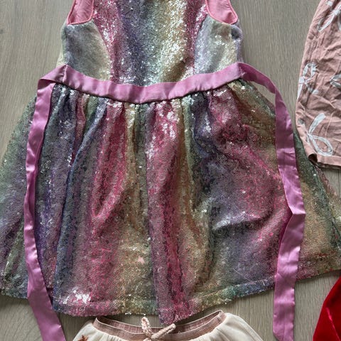 En nydelig festkjole og to skjørt i størrelse 110/116. Kjolen har glitter og er perfekt til bursdager eller andre festlige anledninger. Skjørtene passer også til fest.