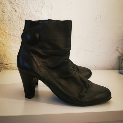 Vakre sko i gul/sennepsgul skinn, hælhøyde 85mm. Meget lekker sko, men ble for liten for meg.
