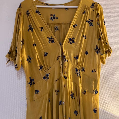 En nydelig kjole fra Faithfull The Brand, kjøpt ny på Retro. Nydelig blågrå farge med hvite blomster med litt brunt. Fin fasong, snøring, liten hempe i utringingen. Ingen skader, ingen flekker, ser ny ut.