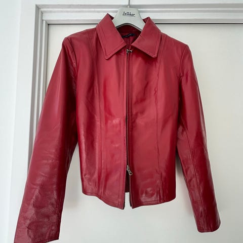Vintage rosa skinnjake med trykknapper. Hel og fin i stoffet og skinnet. Ser knapt brukt ut. Er arvet og flere tiår gammel, men har ligget lagret og ubrukt.