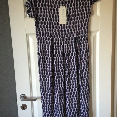 Flott mønstret marineblå/ sort kjole fra Masai i 100% viskose, utringning med glidelås, to lommer i front med glidelås. Korte ermer, A-line fasong, brystvidde 58 cm og lengde 96 cm.
