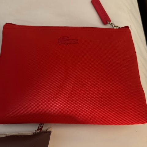 Helt ny, med prislapp. 2 store rom med glidelås. Mørkebrun farge innvendig med sidelommer , en med glidelås, pluss små lommer.