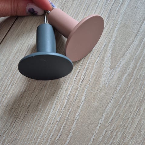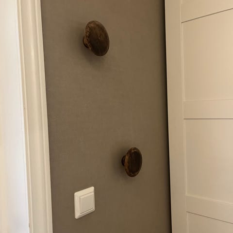 Knottene (lilla/oransje) virker til å være av keramikk eller annen steingods.