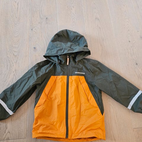 Didriksons barnejakke i størrelse 104, grønn farge. Jakken er 100 % vanntett og har isolert fôr. Passer for både gutter og jenter.