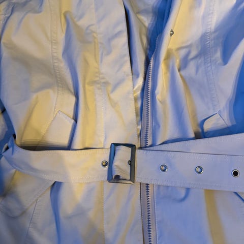 Zara regntøy jakke i beige farge, størrelse L for kvinner. Jakken har glidelås og trykknapper foran, lommer med klaff, og en hette med ekstra beskyttelse bak. Materialet er vannavstøtende, egnet for utendørs bruk i vått vær.