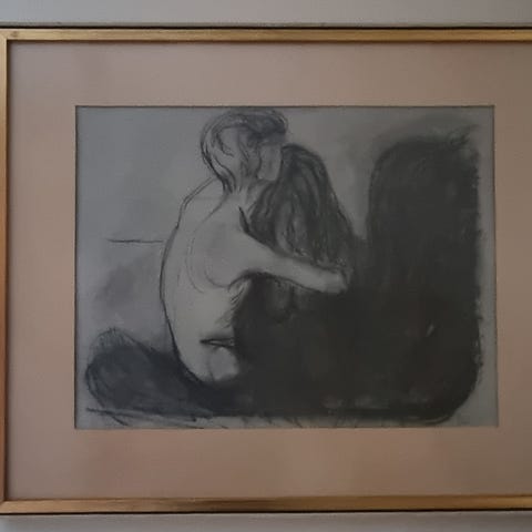Bildet er trolig laget med Caran d`ache fargeblyanter, Bildet er signert. En liten vannskade ved signaturen