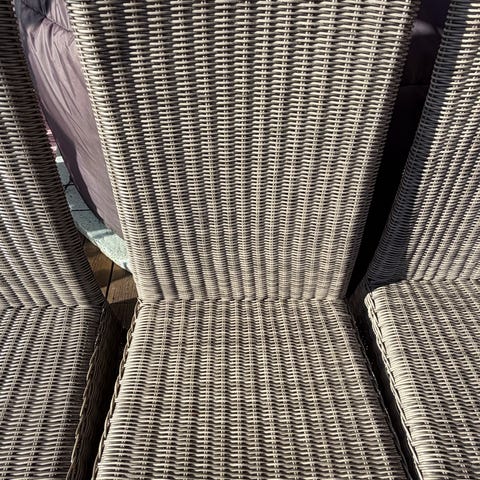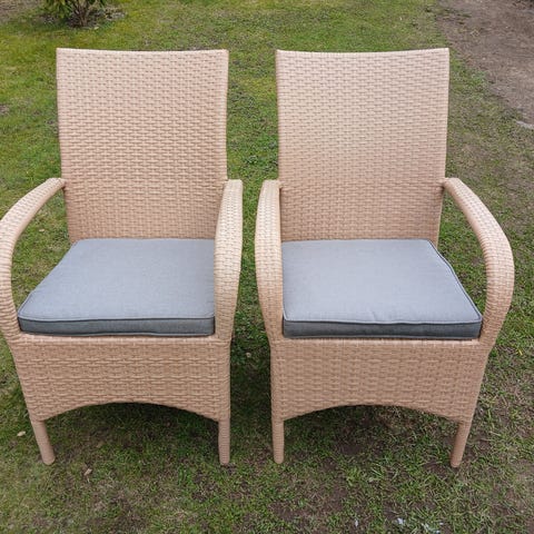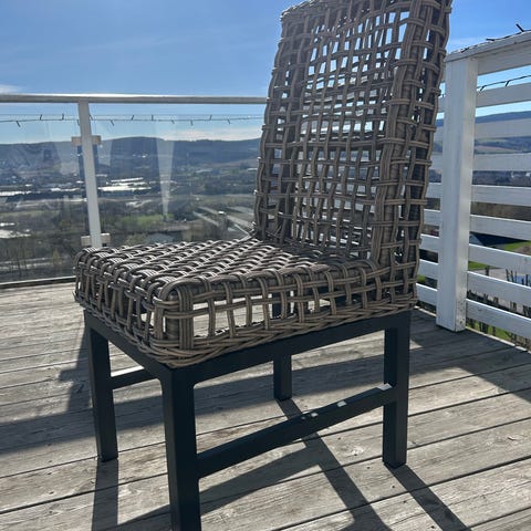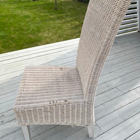 Rotting spiesstol brukt ute, men kan selvfølgelig brukes inne og. Helt hele, fargeforskjell kommer av at det var vått når jeg tok bildene. Har vært oppbevart inne om vinteren.