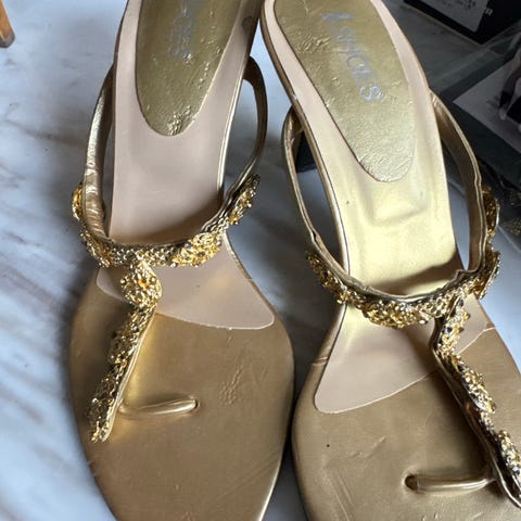 Selger et par elegante sandaler med høy hæl fra merket SAMER. Skoene har en vakker sølvfarge og er dekket av glitrende krystallsteiner og perler, noe som gjør dem perfekte til fest, bryllup eller andre spesielle anledninger.